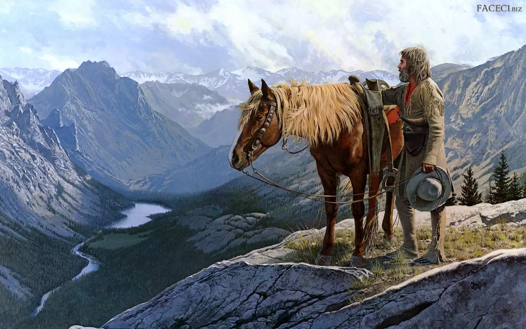 Traper, Koń, Góry, Obraz, Rzeka - faceci.biz